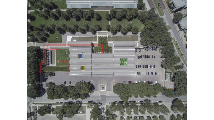 This is an Arial of the Kimbell Art Museum. I would like to make a note. Landscape architect Harriet Pattison along with Landscape architect George Patton collaborated with Louis Kahn on the Kimbell Art Museum’s landscape design.  The three interior courtyards are graphically highlighted with green, yellow, and blue, named for the type of light Mr. Kahn anticipated each courtyard would give. Even though the dimensions of the courtyards and porches will give a better understanding of Mr. Kahn’s ideas, this should be a separate presentation.  The red line will be the path we will follow leading us to the main entry.