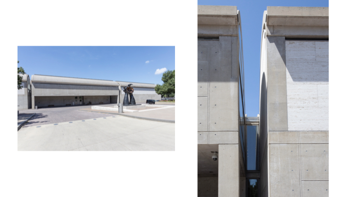 My first observation arriving by car to the museum is the solidness of the building and appearing to be void of the possibly of the sun’s light to enter the museum. Then I realize the joint Mr. Kahn created between the vaults invite the sun’s light into his building. Not only is the light entering the lower and upper galleries through the narrow slot of glass, the ends on both sides of the upper center vault is filled with glass. The sun’s light enters into the offices and library behind the bookstore area.  The entry doors facing the parking area are set into a concrete wall, recessed into the lower level. These are the doors most visitors enter from the parking. However, our path will take us on a journey through courtyards and porches arriving to the main entry on the west side of the Museum.