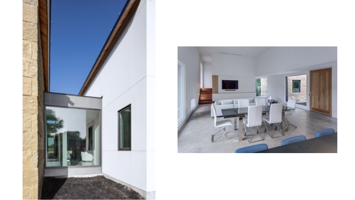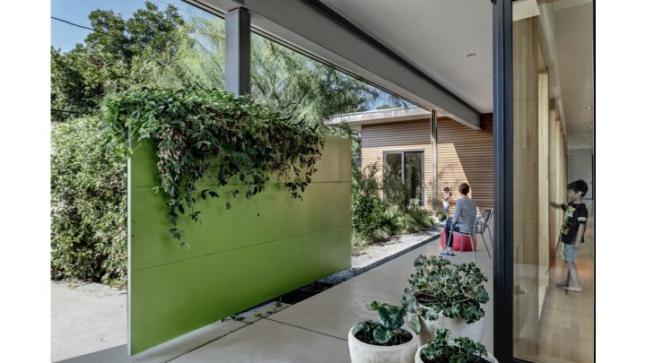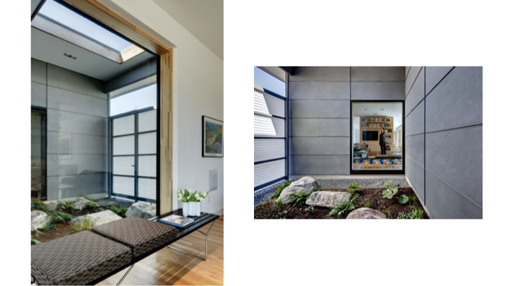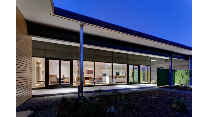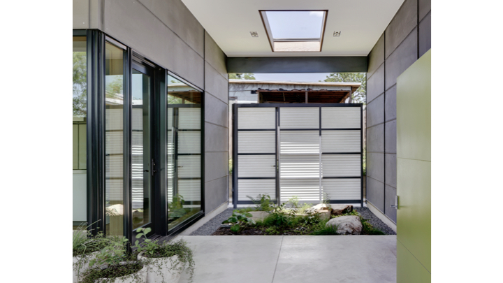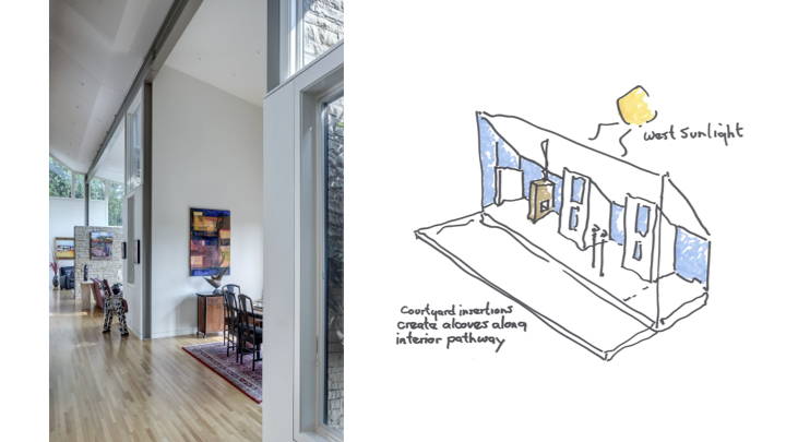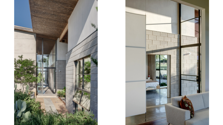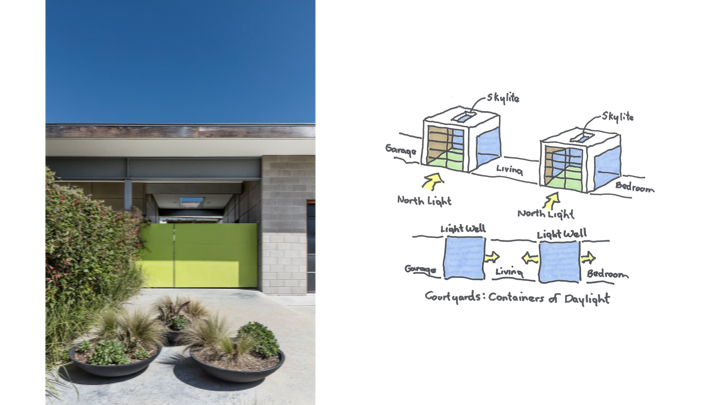 In the Smith Residence, two courtyards form alcoves for the living and dining areas. Large windows are placed above small operable windows to bring ambient light deep into the interiors.