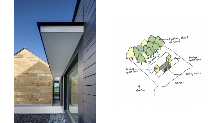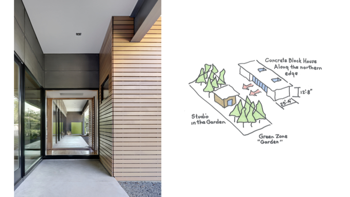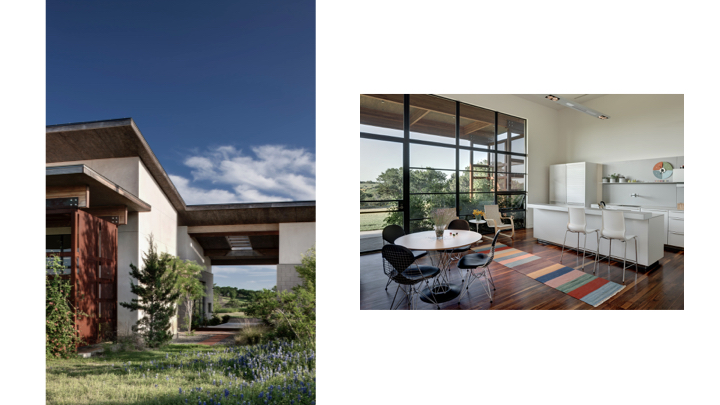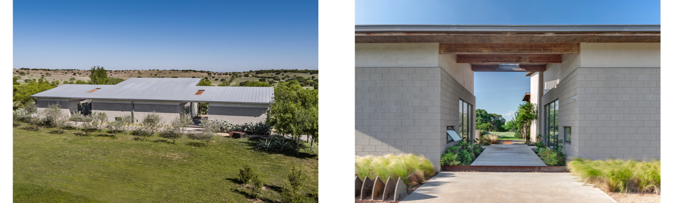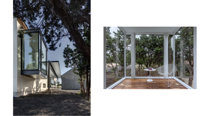 Bluestem is my house, composed of 4 pavilions resting under a single roof canopy. Windows are minimized on the southern face shielding the interiors from the Texas sun, while two breezeways and a north porch filter sunlight entering the interiors. The breezeways allow for southern breezes to flow under the roof canopy. The raised wood walkway is a bridge connecting the landscape on the south with the landscape on the north.