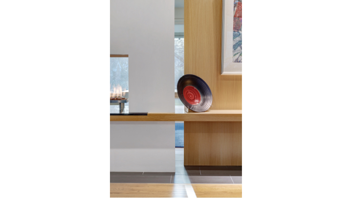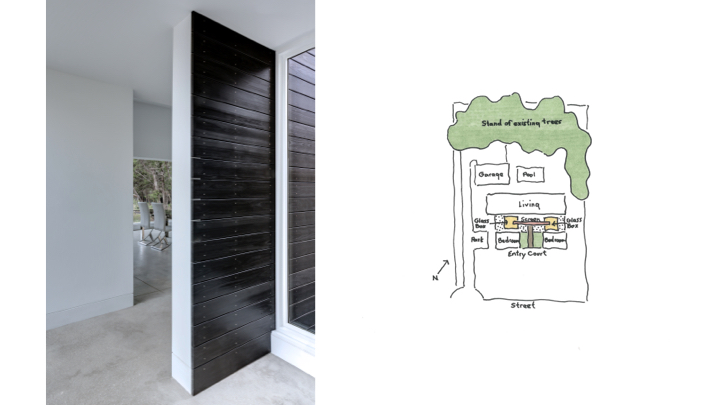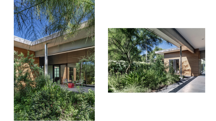 In the Holub Residence, a pair of cubic pavilions brackets the entry courtyard. Passage into the south-facing courtyard is through an open-air wood screen with a steel-blade canopy.  The screens serve to filter the sun’s light. Light and shadow fill the courtyard. The wood walkway is suspended above the landscape leading to the front door, flanked by fixed wood panels that seem to be pulled open for entry.
