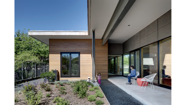 Courtyards and gardens take time to mature. In this case, 5 years. A rain chain is designed with eight chains, one for each grandchild, in an embrace of aluminum pipe that represents their grandmother. This images shows how the interiors and landscape are visually connected.