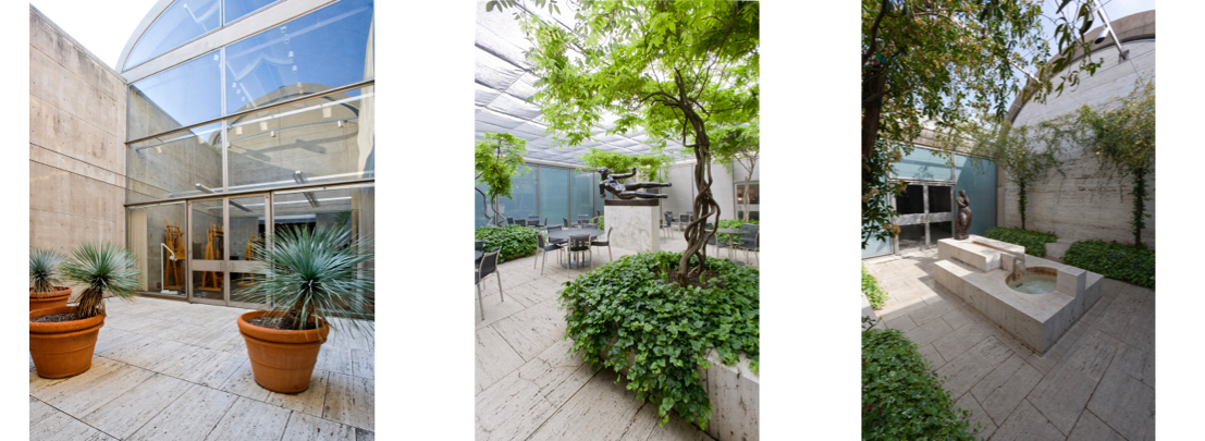 Behind the Porch walls is a long narrow courtyard, open to the sky. Louis Kahn offers the sun’s light to the Museum staff. The courtyard brings ambient light into the lower level administrative offices behind south porch and the shop area behind the north porch.
