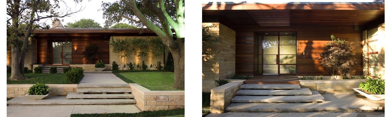 In the Bird Residence, the entry concrete steps lead up to a wooded bridge. The entry wall and ceiling is stained Ipe flanked with sandstone veneer walls. The porch has a deep roof overhang with wood fins inserted into an opening. The roof fins serve as a light baffle allowing sun’s light and shadow to fall onto the wood bridge.