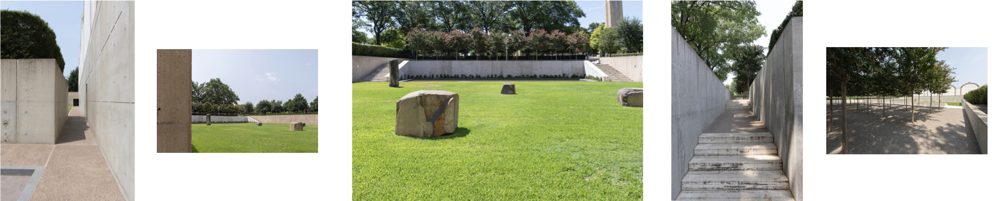 From the parking area, a narrow passageway leads into a sky filled sunken courtyard. There is not a discernible path through the grass courtyard. Interestingly, this journey leads away from the museum building,  A casual stroll through the grassy courtyard leads to a reflecting pool flanked by stairs. Walking up the steps you arrive under the canopy of Crepe Myrtles placed in crushed granite. You have arrived under a canopy of light and shadow. A second entry is located to the far south end of the parking area. These travertine steps lead up to the grove of Crepe Myrtles overlooking the sunken courtyard.