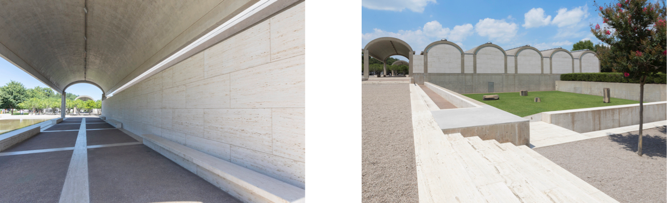 Both paths lead to a wide walkway connecting Camp Bowie Boulevard on the north and Lancaster Avenue on the south. Leaving the shadow filled Crepe Myrtle Canopy, our journey takes a turn to the right. At this point, the vaulted galleries come into full view. Walking on the crushed granite towards the porch, the sound of running water becomes noticeable as the sounds of automobiles disappear. The porch provides shelter under an open vault. A two level pool fronts the porch.  Water pours in a smooth sheet into the lower pool. Under the porch vault, the crushed granite is placed in concrete interlaced with travertine.