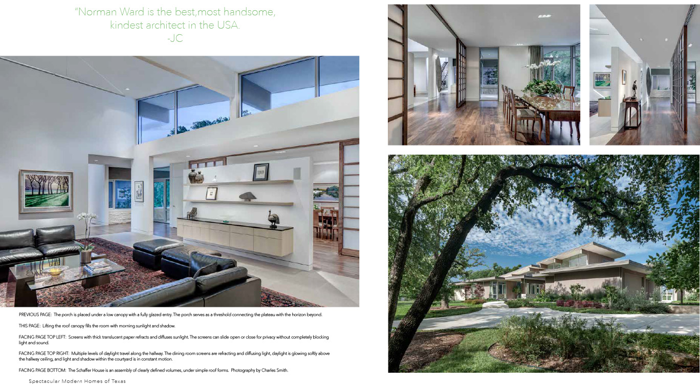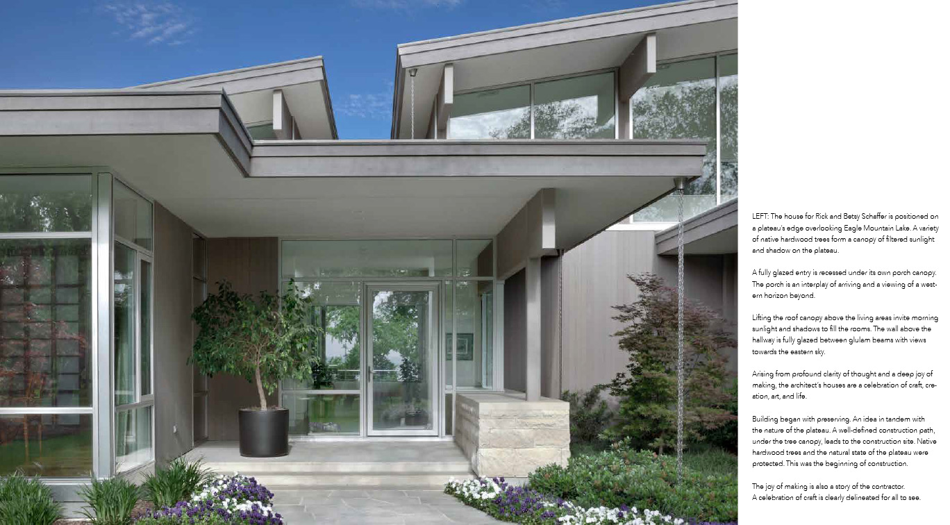 The house for Rick and Betsy Schaffer is positioned on a plateau’s edge overlooking Eagle Mountain Lake. A variety of native hardwood trees form a canopy of filtered sunlight and shadow on the plateau. A fully glazed entry is recessed under its own porch canopy. The porch is an interplay of arriving and a viewing of a western horizon beyond. Lifting the roof canopy above the living areas invite morning sunlight and shadows to fill the rooms. The wall above the hallway is fully glazed between glulam beams with views towards the eastern sky.